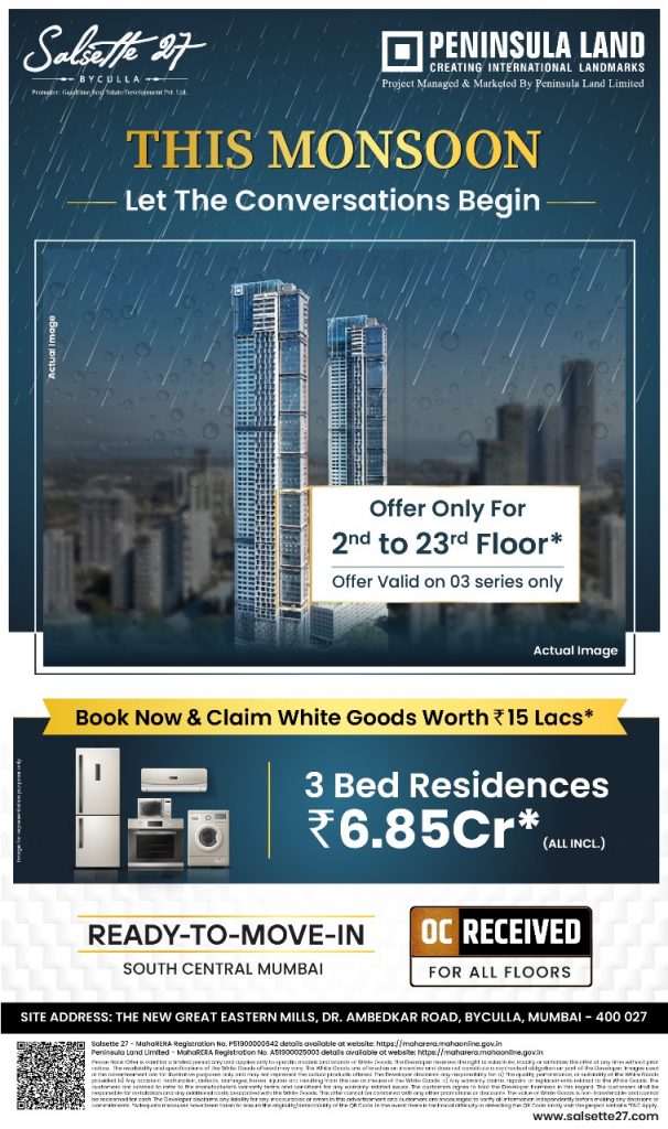 Discover Mumbai's skyline, highlighted by the vast Arabian Sea and the Eastern Harbour. Embrace the city's expansive feel and its natural beauty. Enjoy the privileged lifestyle steeped in Mumbai’s nostalgic allure. At Salsette 27, an exclusive residential community, the grandeur of Mumbai's past is revived. Experience luxury with spacious, contemporary 2 & 3 BHK residences in Byculla.